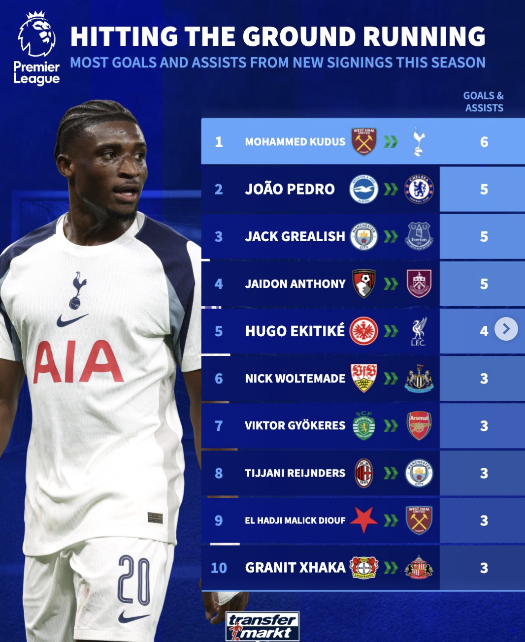 Kudus, người chuyển đến Tottenham từ West Ham United vào mùa hè này, đã tham gia vào 6 bàn thắng, xếp thứ nhất. Pedro của Chelsea, Grealish của Everton và Anthony của Burnley theo sau với 5 bàn thắng.